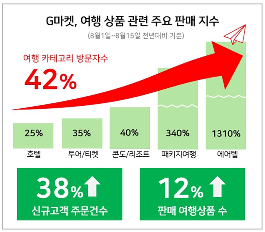신세계그룹 계열 이커머스 G마켓에 따르면, 8월 들어(8/1~8/15) 여행상품 관련 ▲방문자수 ▲신규고객 주문건수 ▲판매자 등록상품 수 ▲카테고리별 판매신장률 등 주요 지표가 모두 전년대비 급증한 것으로 조사됐다.