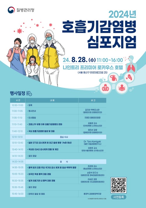 질병관리청은 8월 28일(수)에 호흡기감염병 발생 동향 및 그간의 대응 사례를 공유하기 위해「2024년 호흡기감염병 심포지엄」을 개최한다고 밝혔다.