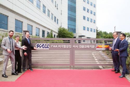 한국항공대는 24일 교내에서 FAA 미국 항공정비사 자격증 전문 교육기관 현판 제막식을 개최했다. 행사에는 한국항공대 허희영 총장, 최병권 사무처장, 김인규 비행교육원장, 김성길 항공기술교육원 원장, 김종복 항공기술교육원 부원장과 함께 미국 항공 전문 교육기관인 US Aviation Academy(USAA)의 저스틴 사이크스(Justin Sykes) CFO, 스콧 사이크스(Scott Sykes) 개발총괄책임자, 스토미 사이크스(Stormy Sykes) 교육책임자 등이 참석했다.
