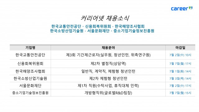 커리어넷, 한국교통안전공단·신용회복위원회·한국해양조사협회·한국소방산업기술원·서울문화재단·중소기업기술정보진흥원 채용 소식 발표
