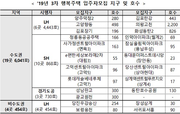 지역별로는 잠실아이파크·성남판교 등 수도권 19곳 6041가구, 서귀포서흥·당진우강 등 비수도권 4곳 454가구가 공급된다.