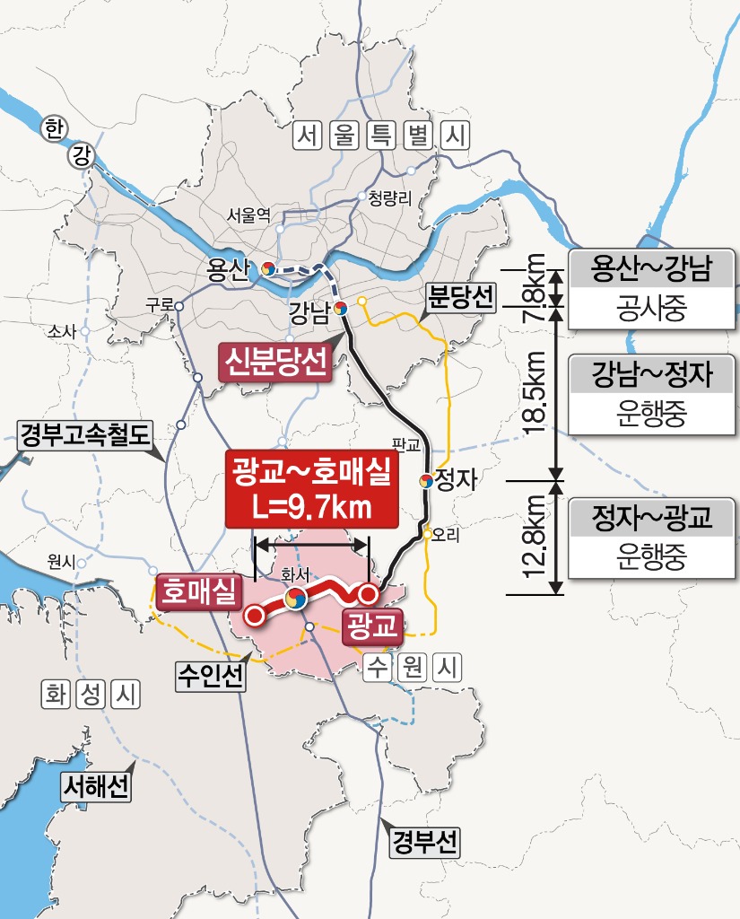 경기 서남부권 주민들의 숙원사업인 신분당선 광교∼호매실 노선이 예비타당성조사를 통과*하여 사업 추진이 확정되었다.